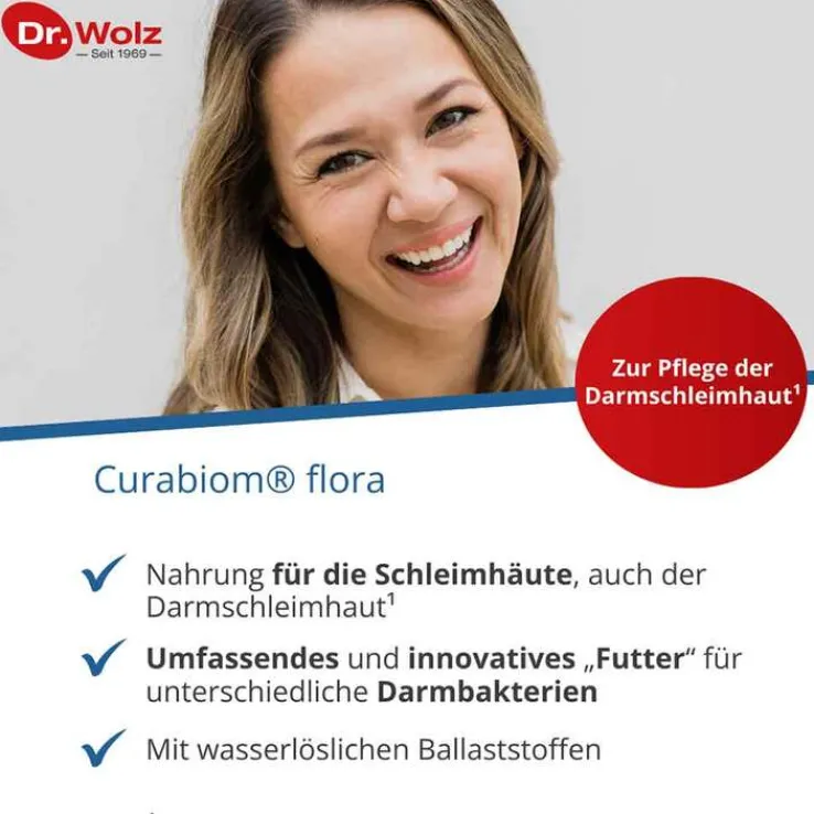 Kapseln Curabiom® flora duo Darmkur: Zwei Kapseln enthalten 50 Milliarden Milchsäurebakterien sowie 0,55 mg Vitamin B1, 0,70 mg Vitamin B2, 0,70 mg Vitamin B6, 2,5 µg Vitamin B12, 50 µg Biotin und 100 µg Folsäure.