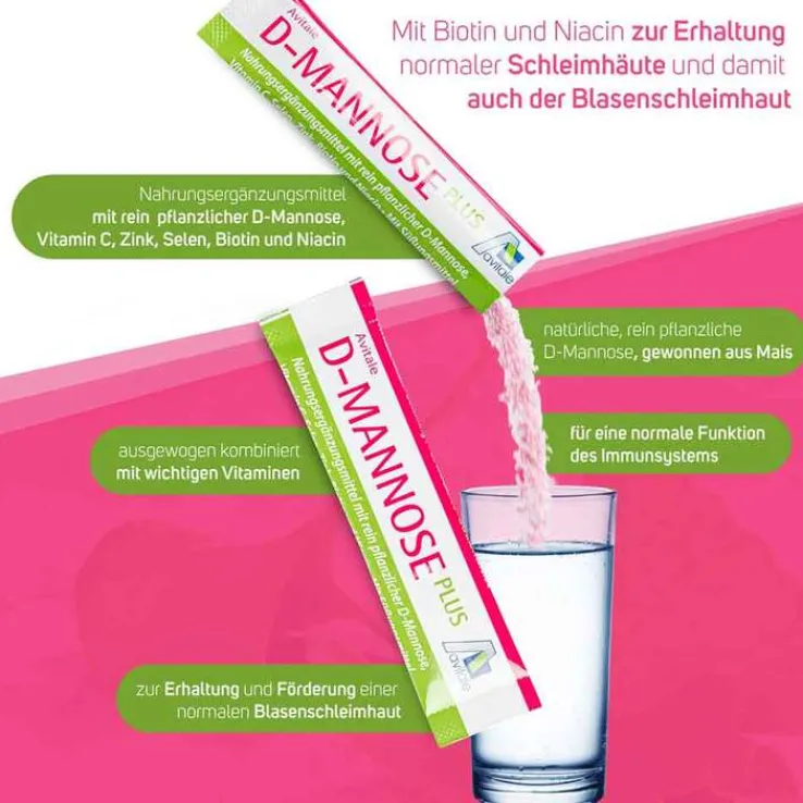 D-Mannose ist eine in der Natur vorkommende Zuckerart, die mit Traubenzucker (Glucose) verwandt ist. Sie wird vom menschlichen Körper in geringem Umfang selbst hergestellt, aber kaum verwertet. Avitale D-Mannose Plus enthält rein pflanzliche D-Mannose, gewonnen aus Mais. Sie wurde ausgewogen kombiniert mit wichtigen Vitaminen und Mineralstoffen für das Wohlbefinden von Frauen.