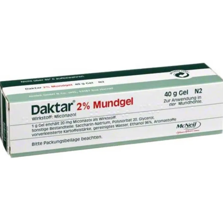 Daktar® 2 % Mundgel Wirkstoff: Miconazol. Anwendungsgebiete: Pilztötendes Arzneimittel zur Behandlung von Pilzerkrankungen der Schleimhaut (Antimykotikum) des Mund-Rachen-Raumes bei Säuglingen ab 4 Monaten, Kindern und Erwachsenen. Warnhinweise: Enthält 24,33 mg Alkohol (Ethanol) in 2,5 ml (1/2 Messlöffel) entsprechend 0,785 Gew. %. Zu Risiken und Nebenwirkungen lesen Sie die Packungsbeilage und fragen Sie Ihre Ärztin, Ihren Arzt oder in Ihrer Apotheke. Johnson & Johnson GmbH, 41470 Neuss. Stand: 02/2023