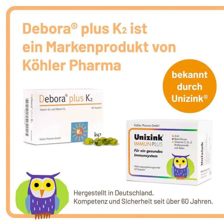 Die wirksamen Substanzen des Präparats stellen Vitamin D3 (Cholecalciferol), sowie Vitamin K2 (als Menachion-7) dar. Da Vitamin D3 und K2 fettlösliche Vitamine sind und diese als Transportmedium pflanzliche Öle benötigen, sind die Gluten-, Fruktose, Hefe- und Laktosefreien Kapseln von Köhler Pharma aufgelöst in nativem Leinsamenöl und Sonnenblumenöl. Dadurch ist die Einnahme von Debora plus K2 auch unabhängig von den Mahlzeiten möglich.