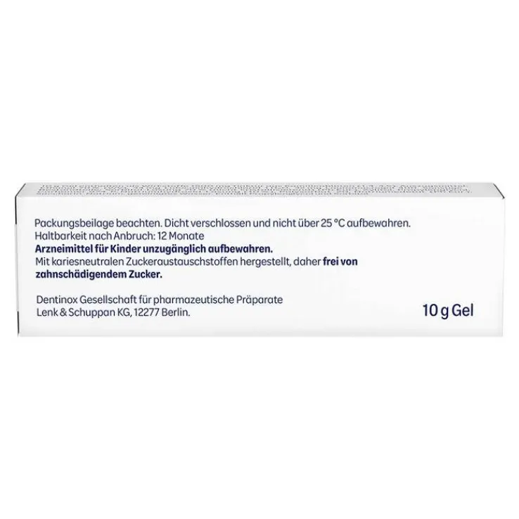 Dentinox®-Gel N Zahnungshilfe. Anwendungsgebiete: Traditionell angewendet als mild wirkendes Arzneimittel zur kurzzeitigen Linderung der Beschwerden bei der ersten Zahnung. Enthält Propylenglycol und Sorbitol. Zu Risiken und Nebenwirkungen lesen Sie die Packungsbeilage und fragen Sie Ihre Ärztin, Ihren Arzt oder in Ihrer Apotheke. Stand: 06/2020. Dentinox Gesellschaft für pharmazeutische Präparate Lenk & Schuppan KG, Nunsdorfer Ring 19, 12277 Berlin, Germany