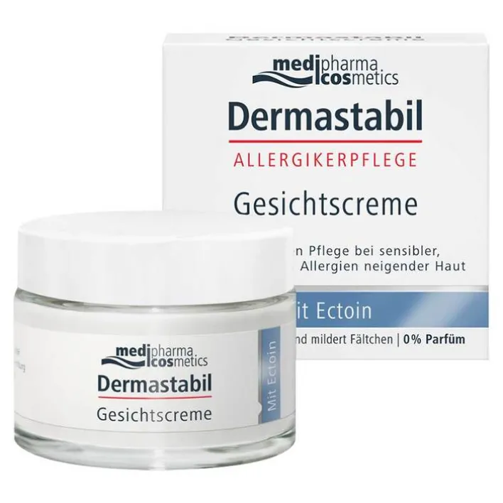 Sensible und zu Allergien neigende Gesichtshaut ist im Alltag unterschiedlichsten Umwelteinflüssen ausgesetzt. Sie braucht ausreichende Pflege, ohne einen Lipidfilm auf der Hautoberfläche zu hinterlassen. Dermastabil Gesichtscreme spendet reichhaltige Feuchtigkeit und pflegt die von externen Stressfaktoren wie Allergenen und schädlichen Umweltschadstoffen belastete Haut. Sie zieht schnell ein und fettet nicht. Das enthaltene Ectoin stärkt und stabilisiert die Hautschutzbarriere, glättet und mildert Fältchen.