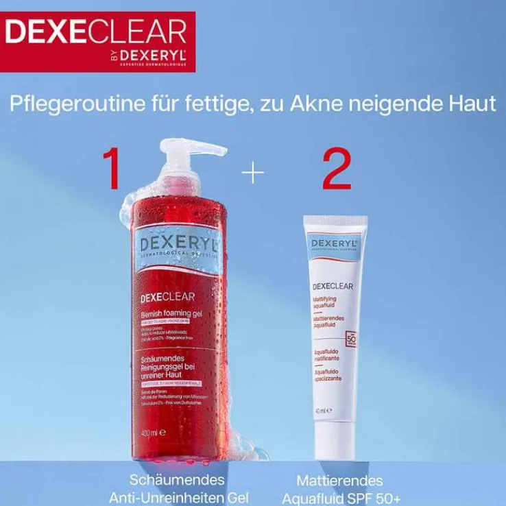 Die 2-in-1-Formel reinigt die Haut und reduziert überschüssigen Talg um 90 %¹ bereits nach der ersten Anwendung. Sie bekämpft effektiv Hautunreinheiten und befreit verstopfte Poren. Erhalten Sie eine verfeinerte Hautstruktur mit dem Dexeclear Anti-Unreinheiten schäumenden Gel, welches überschüssigen Tag und Pickel reduziert².