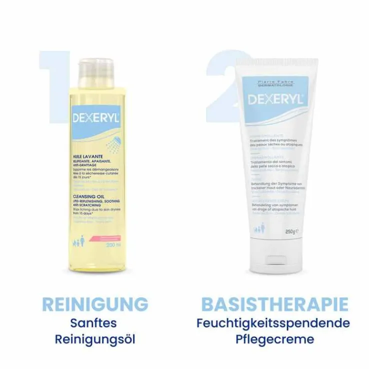 Das DEXERYL Reinigungsöl ist speziell für die sanfte Reinigung und Pflege trockener und zu Atopie (Neurodermitis) neigender Haut konzipiert, die durch die Reinigung mit Seife gereizt werden könnte. Es entfernt Unreinheiten und schützt die Haut vor dem Austrocknen. Dank seiner feuchtigkeitsspendenden Eigenschaften unterstützt es die Wiederherstellung der Hautbarriere und bietet eine intensive Pflege. Bei regelmäßiger Anwendung verschwindet Juckreiz, der durch Hauttrockenheit verursacht wird.¹ Das milde Reinigungsöl eignet sich für die tägliche Anwendung und hinterlässt ein samtweiches Hautgefühl. Es ist für Erwachsene, Kinder sowie für Babys ab dem ersten Lebenstag geeignet.