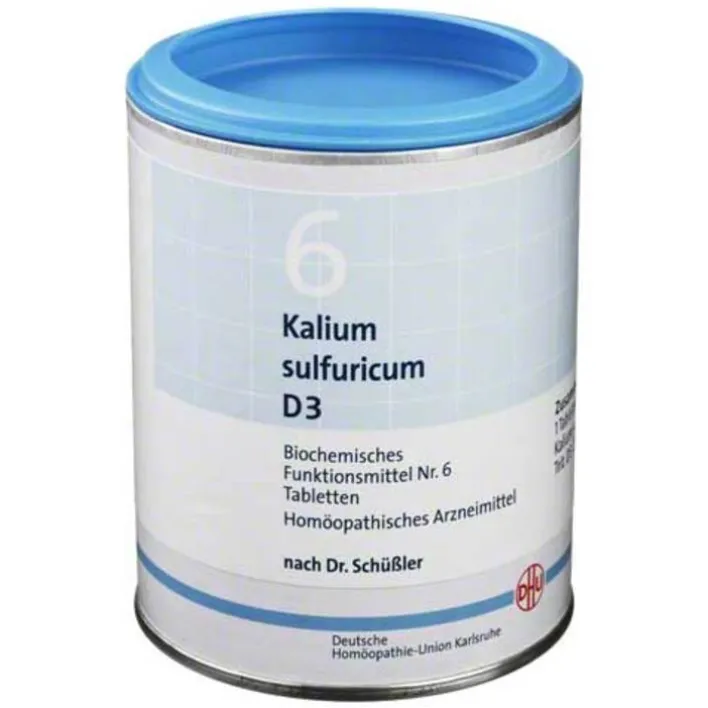 DHU Schüßler-Salz Nr. 6® Kalium sulfuricum D3 Anwendungsgebiete: Registriertes homöopathisches Arzneimittel, daher ohne Angabe einer therapeutischen Indikation. Zu Risiken und Nebenwirkungen lesen Sie die Packungsbeilage und fragen Sie Ihre Ärztin, Ihren Arzt oder in Ihrer Apotheke. Enthält Lactose und Weizenstärke. Packungsbeilage beachten! Deutsche Homöopathie-Union DHU-Arzneimittel GmbH & Co. KG, Karlsruhe
