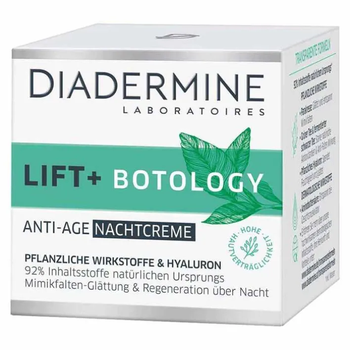 Mit dem Alter verliert die Haut an Elastizität und Mimikfalten werden zu dauerhaft-sichtbaren Falten. Nachts ist der ideale Zeitpunkt, um die Haut mit hochwertigen Wirkstoffen zu versorgen und die natürliche Regeneration über Nacht zu verstärken. Die Diadermine Lift+ Botology Nachtcreme mit 92% Inhaltsstoffen natürlichen Ursprungs (inkl. Wasser) sorgt für Mimikfalten-Glättung & Regeneration über Nacht.