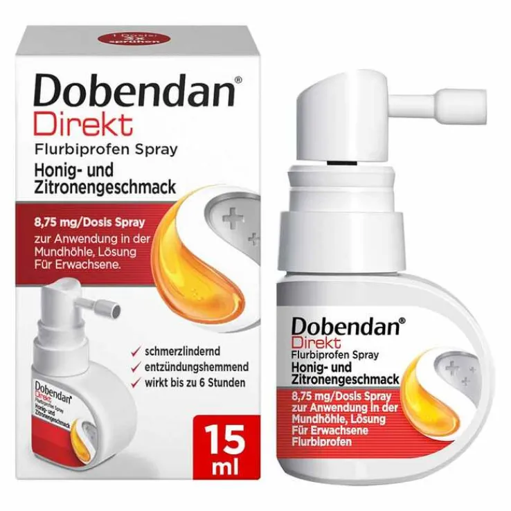 Dobendan® Direkt Flurbiprofen Spray Honig- und Zitronengeschmack 8,75 mg/Dosis Spray zur Anwendung in der Mundhöhle, Lösung Wirkstoff: Flurbiprofen Anwendungsgebiete: zur kurzzeitigen symptomatischen Behandlung von akuten Halsschmerzen bei Erwachsenen. Warnhinweise: enthält: Methyl-4-hydroxybenzoat (Ph.Eur.) (E218) und Propyl-4-hydroxybenzoat (Ph.Eur.) (E216), Levomenthol, Sucrose, Glucose (enthält Weizenstärke und Schwefeldioxid (E220)), Honig, Zitronenaroma (enthält Butylhydroxyanisol (E320), Citral, Citronellol, d-Limonene, Farnesol, Geraniol und Linalool). Packungsbeilage beachten. Zu Risiken und Nebenwirkungen lesen Sie die Packungsbeilage und fragen Sie Ihre Ärztin, Ihren Arzt oder in Ihrer Apotheke. DOBD0172 Reckitt Benckiser Deutschland GmbH – 69067 Heidelberg