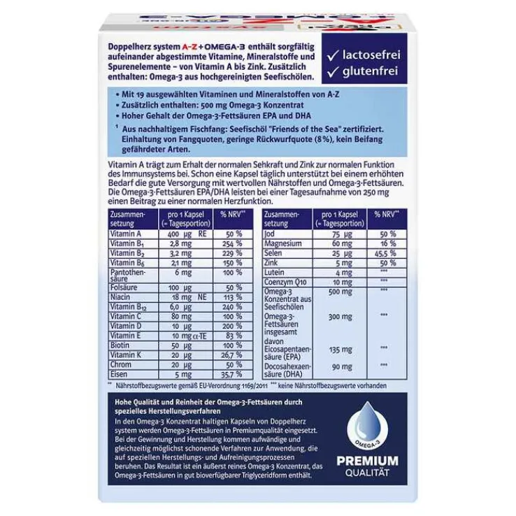 Doppelherz system A-Z + Omega-3 enthält sorgfältig aufeinander abgestimmte Vitamine, Mineralstoffe und Spurenelemente – von Vitamin A bis Zink.* Zusätzlich enthalten sind Coenzym Q10, Lutein und Omega-3 aus hochgereinigten Seefischölen.