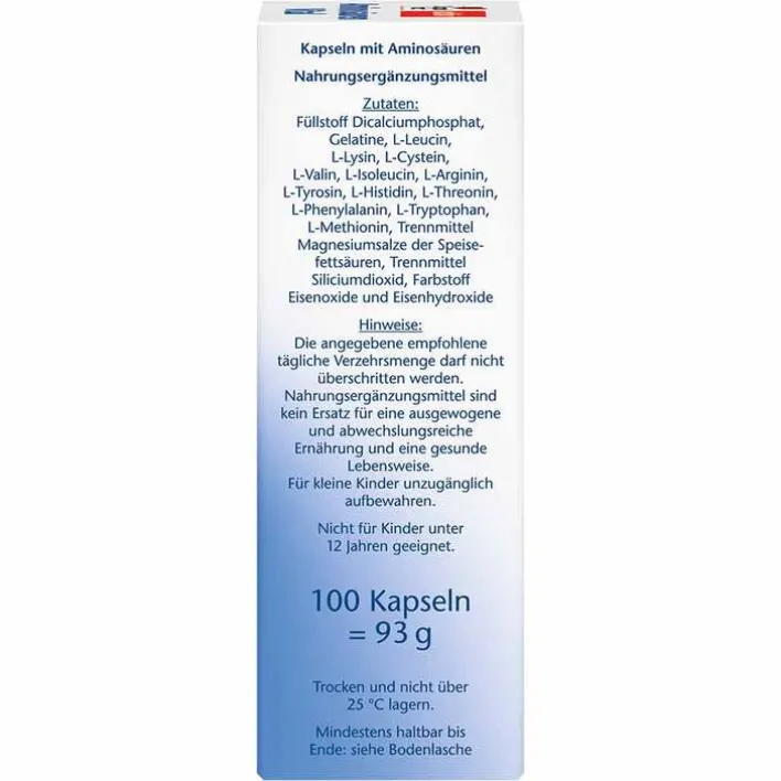Füllstoff Dicalciumphosphat, Gelatine, L-Leucin, L-Lysin, L-Cystein, L-Valin, L-Isoleucin, L-Arginin, L-Tyrosin, L-Histidin, L-Threonin, L-Phenylalanin, L-Tryptophan, L-Methionin, Trennmittel Magnesiumsalze der Speisefettsäuren, Trennmittel Siliciumdioxid, Farbstoff Eisenoxide und Eisenhydroxide