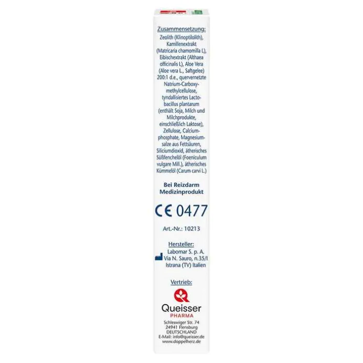 Zeolith (Klinoptilolith), Kamillenextrakt (Matricaria chamomilla L), Eibischextrakt (Althaea officinalis L) Aloe Vera (Aloe vera L., Saftgelee) 200:1 d.e., quervernetzte Natrium-Carboxymethylcellulose, tyndallisiertes Lactobacillus plantarum (enthält Soja, Milch und Milchprodukte, einschließlich Laktose), Zellulose, Calciumphosphate, Magnesiumsalze aus Fettsäuren, Siliciumdioxid, ätherisches Süßfenchelöl (Foeniculum vulgare Mill.), ätherisches Kümmelöl (Carum carvi L.)