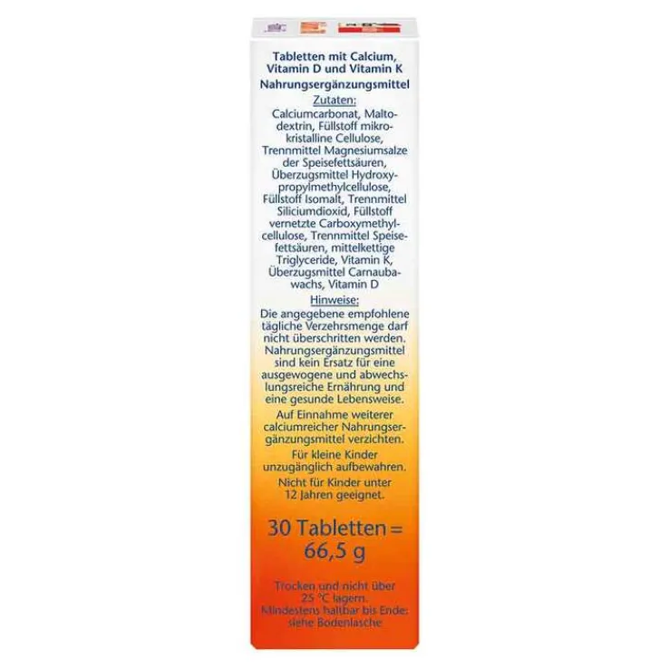 Calciumcarbonat, Maltodextrin, Füllstoff mikrokristalline Cellulose, Trennmittel Magnesiumsalze der Speisefettsäuren, Überzugsmittel Hydroxypropylmethylcellulose, Füllstoff Isomalt, Trennmittel Siliciumdioxid, Füllstoff vernetzte Carboxymethylcellulose, Trennmittel Speisefettsäuren, mittelkettige Triglyceride, Vitamin K, Überzugsmittel Carnaubawachs, Vitamin D.