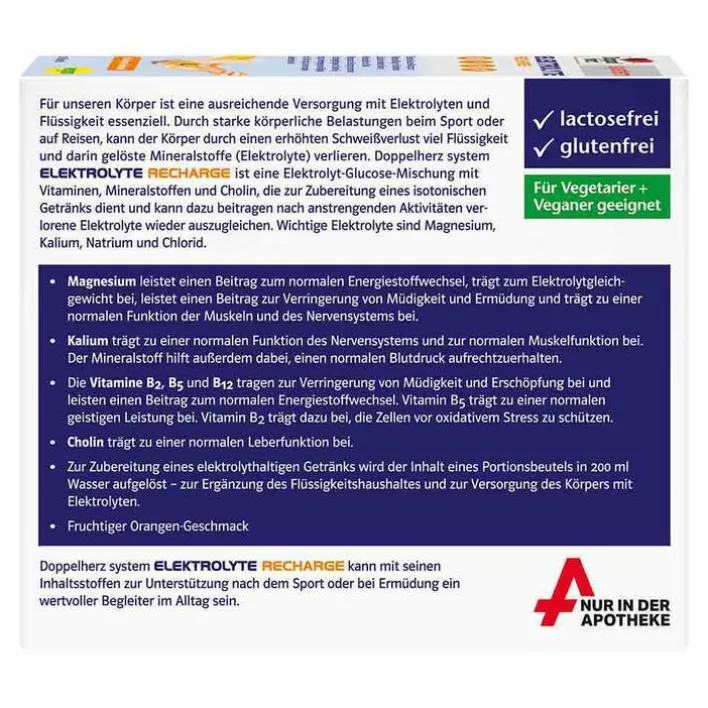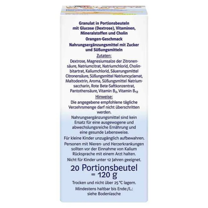 - Nahrungsergänzungsmittel mit Glucose (Dextrose), Vitaminen, Mineralstoffen und Cholin Elekrolyt-Glucose-Mischung mit Orangen-Geschmack