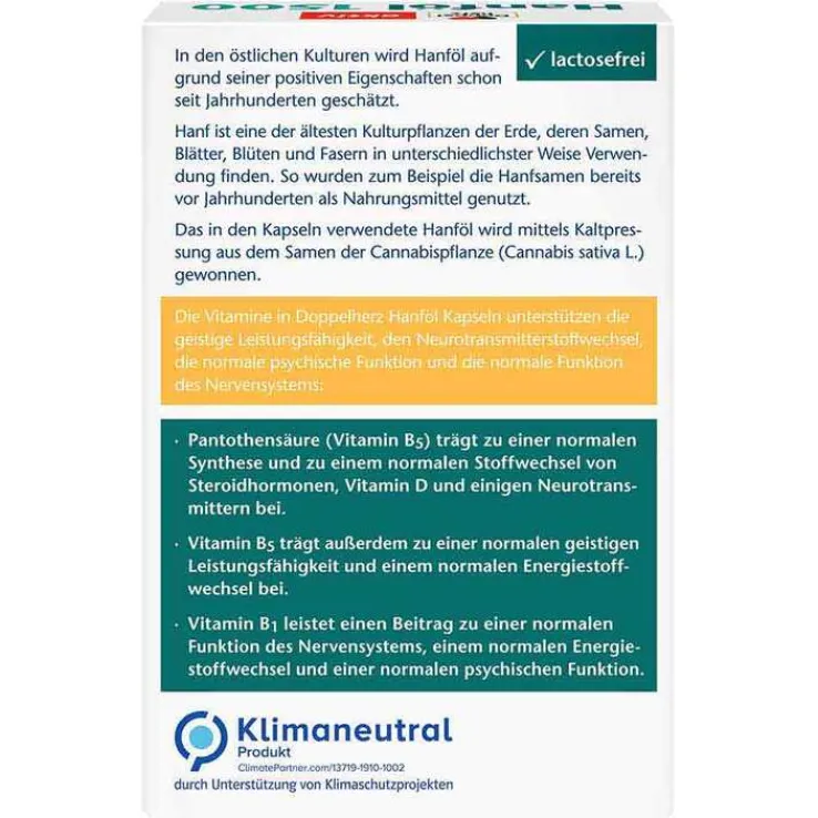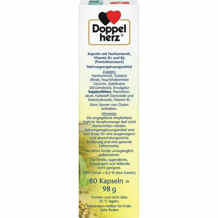 Pro Tagesportion (2 Kapseln) sind in den Doppelherz Hanföl Kapseln 1500 mg Hanföl, 150 mg Hanfpulver mit 1,1 mg Vitamin B1 sowie 6 mg Pantothensäure (Vitamin B5) kombiniert.