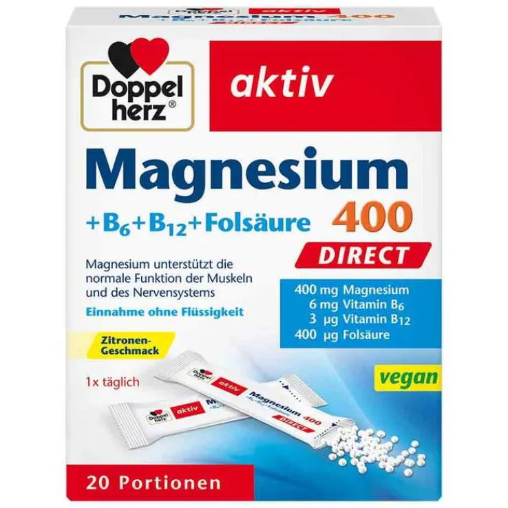 Bei einer unausgewogener Ernährung oder einem hohen Nährstoffbedarf, z. B. durch körperliche Anstrengung, empfiehlt sich eine Nahrungsergänzung mit Doppelherz Magnesium 400+B6+B12+Folsäure Direct.