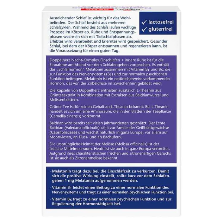 Doppelherz Nacht-Komplex Einschlafen + Innere Ruhe ist für die Einnahme am Abend vor dem Schlafengehen vorgesehen. Es enthält das Schlafhormon Melatonin zusammen mit Vitamin B1 und B6, die zur Funktion des Nervensystems (B1)* und zur normalen psychischen Funktion* beitragen.