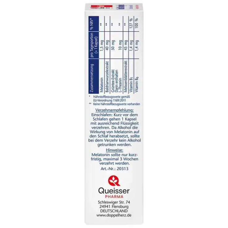 - Nahrungsergänzungsmittel mit Melatonin, L-Theanin aus Grünteeextrakt, Extrakten aus Baldrianwurzel und Melissenblättern, Vitamin B1 und Vitamin B6