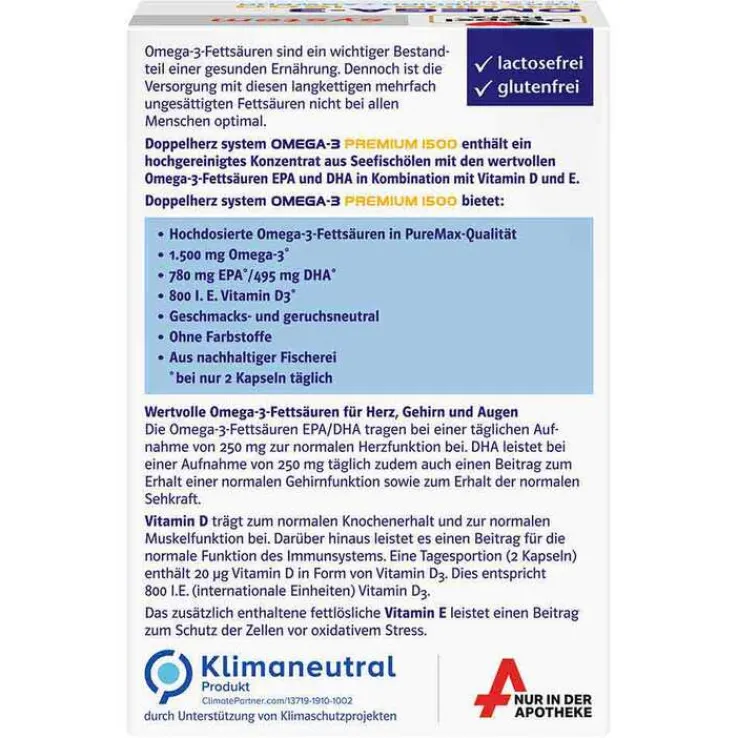 Doppelherz system Omega-3 Premium 1500 System Kapseln enthalten ein hochgereinigtes Konzentrat aus Seefischölen mit den wertvollen Omega-3-Fettsäuren EPA und DHA in Kombination mit Vitamin D3 und E. Durch die hohe Konzentration an Omega-3-Fettsäuren liefern bereits 2 Kapseln täglich 1.500 mg Omega-3-Fettsäuren, davon 780 mg EPA und 495 mg DHA. Dadurch kann auch bei einem erhöhten Bedarf eine gute Versorgung mit den wertvollen Omega-3-Fettsäuren unterstützt werden.