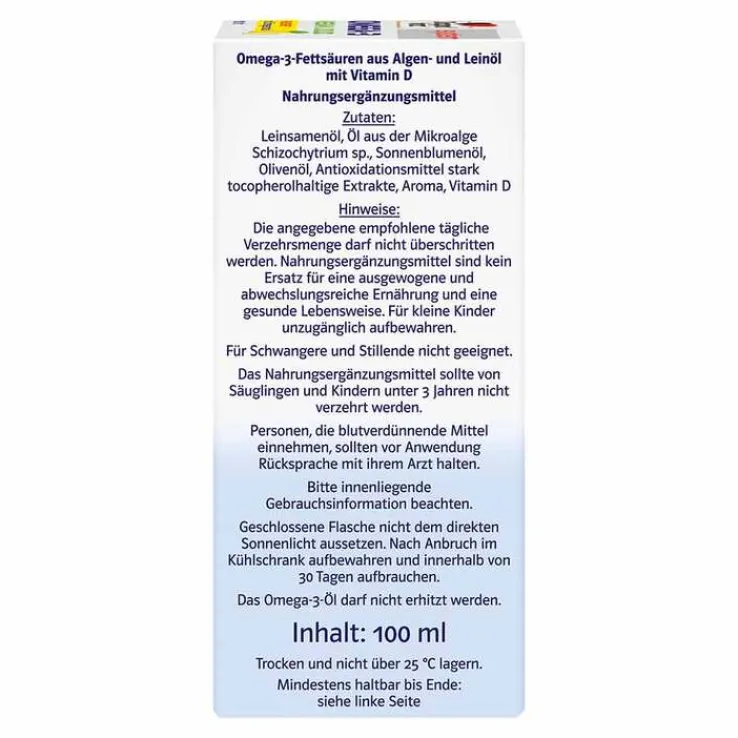 - flüssige Omega-3-Fettsäuren aus hochwertigem Algenöl und Leinöl