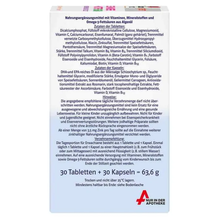 * Folsäure trägt zur Zellteilung und zum mütterlichen Gewebewachstum während der Schwangerschaft bei. Vitamin B1 und B2, Niacin und Vitamin B5 (Pantothensäure) unterstützen den normalen Energiestoffwechsel. Vitamin B6 trägt zum normalen Eiweißstoffwechsel bei. Vitamin B12 leistet einen Beitrag zur normalen Bildung der roten Blutkörperchen und zur normalen Funktion des Nervensystems. Biotin unterstützt die Erhaltung gesunder Haut und Haare. Vitamin A¹ trägt zur Zellteilung und einer normalen Funktion des Immunsystems bei. Vitamin C unterstützt die normale Funktion des Immunsystems. Eisen unterstützt die normale Bildung der roten Blutkörperchen und den normalen Sauerstofftransport im Körper. Calcium und Vitamin D tragen zum Erhalt von Knochen und Zähnen bei. Vitamin D unterstützt zudem die Zellteilung. Jod trägt zu einer normalen Produktion von Schilddrüsenhormonen und zu einer normalen Schilddrüsenfunktion, zu einer normalen Funktion des Nervensystems und zum normalen Energiestoffwechsel bei. Magnesium trägt zum normalen Energiestoffwechsel und zur normalen Funktion des Nervensystems und der Muskeln bei. Zink leistet einen Beitrag zur normalen Funktion des Immunsystems und zum Schutz der Zellen vor oxidativem Stress. Die Aufnahme der Omega-3-Fettsäure Docosahexaensäure (DHA) durch die Mutter trägt zur normalen Entwicklung der Augen und des Gehirns beim Fötus und beim gestillten Säugling bei. Hierfür sollten zusätzlich zu der für Erwachsene empfohlene Tagesmenge an Omega-3-Fettsäuren täglich 200 mg DHA aufgenommen werden.