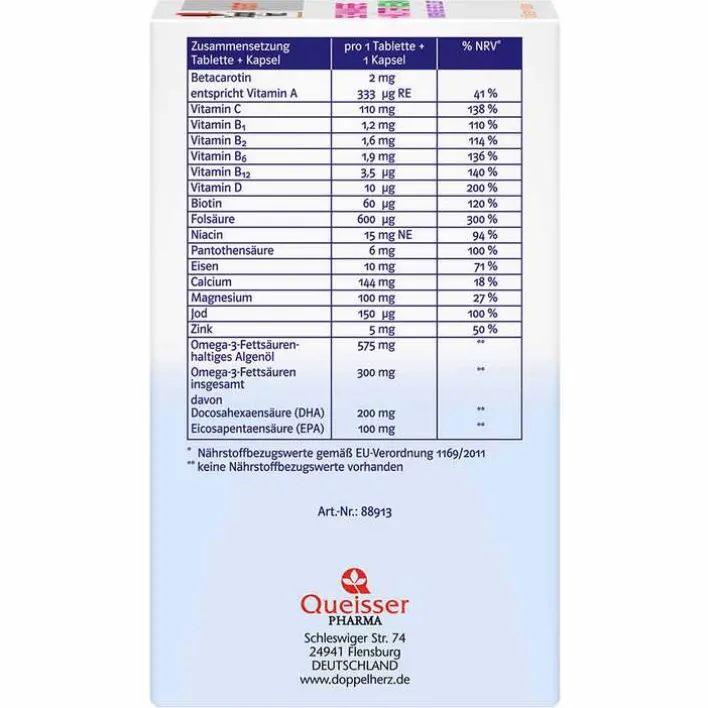 Das Tablette+Kapsel-System von Doppelherz besteht aus einer gut schluckbaren Tablette und einer leicht einzunehmenden Kapsel. Beide zusammen liefern eine umfangreiche Nährstoff-Kombination, um die Versorgung mit Nährstoffen bzw. einen erhöhten Bedarf zu decken.