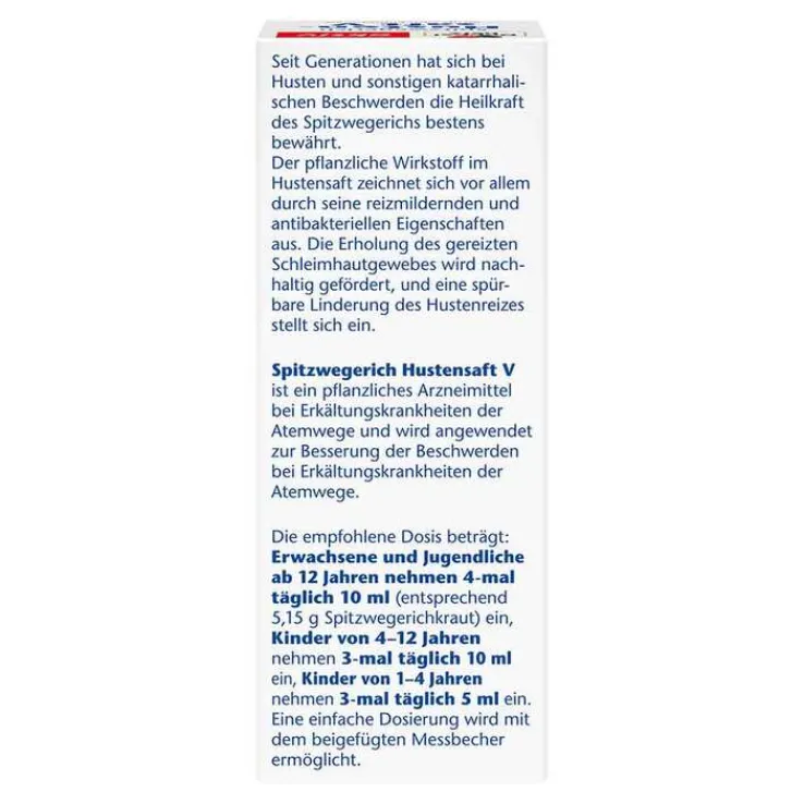 Spitzwegerich Hustensaft V, Sirup zum Einnehmen. Für Erwachsene und Kinder ab 1 Jahr. Wirkstoff: 8,04 g Dickextrakt aus Spitzwegerichkraut (1,5 – 1,7:1), Auszugsmittel Ethanol 20 % (m/m) / 100 ml. Anwendungsgebiet: Spitzwegerich Hustensaft V ist ein pflanzliches Arzneimittel bei Erkältungskrankheiten der Atemwege und wird angewendet zur Besserung der Beschwerden bei Erkältungskrankheiten der Atemwege. Warnhinweise: Enthält Sucrose (Saccharose/Zucker), Glucose und Pfefferminzöl. Zu Risiken und Nebenwirkungen lesen Sie die Packungsbeilage und fragen Sie Ihre Ärztin, Ihren Arzt oder in Ihrer Apotheke. Stand 09/2019