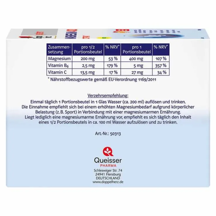 Einmal täglich 1 Portionsbeutel in 1 Glas Wasser (ca. 200 ml) auflösen und trinken. Die Einnahme empfiehlt sich bei einem erhöhten Magnesiumbedarf aufgrund körperlicher Belastung (z. B. Sport), wenn gleichzeitig eine unausgewogene Ernährung vorliegt. Liegt lediglich eine magnesiumarme Ernährung vor, empfiehlt es sich täglich den Inhalt eines ½ Portionsbeutels in ca. 100 ml Wasser aufzulösen und zu trinken.
