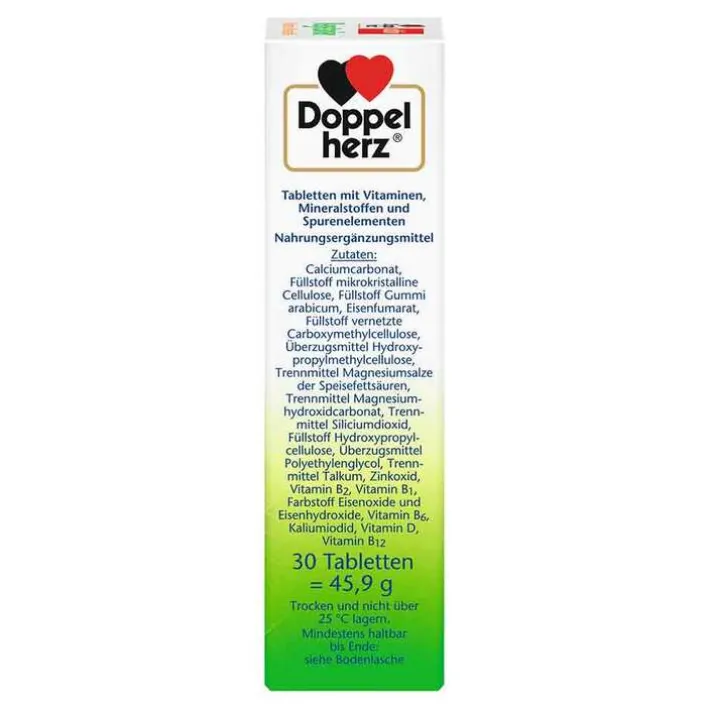Calciumcarbonat, Füllstoff mikrokristalline Cellulose, Maltodextrin, Überzugsmittel Hydroxypropylmethylcellulose, Eisenfumarat, Trennmittel Siliciumdioxid, Trennmittel Talkum, Füllstoff vernetzte Carboxymethylcellulose, Trennmittel Magnesiumsalze der Speisefettsäuren, Trennmittel Speisefettsäuren, Zinkoxid, Farbstoff Eisenoxide und Eisenhydroxide, Vitamin B1, Vitamin B2, Vitamin B6, Kaliumiodid, Vitamin D, Vitamin B12.