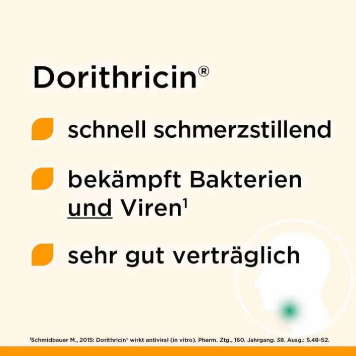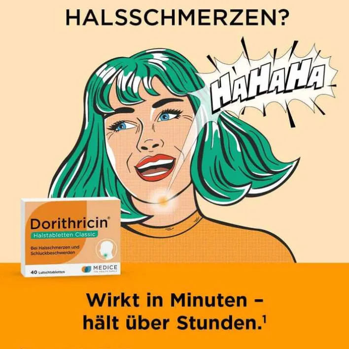 Dorithricin® Halstabletten Classic. Anwendungsgebiete: Zur symptomatischen Behandlung bei Infektionen des Mund- und Rachenraumes mit Halsschmerzen und Schluckbeschwerden. Enthält Sorbitol und Minzöl. Zu Risiken und Nebenwirkungen lesen Sie die Packungsbeilage und fragen Sie Ihre Ärztin, Ihren Arzt oder in Ihrer Apotheke. Stand 04/2022. MEDICE Arzneimittel, 58638 Iserlohn.