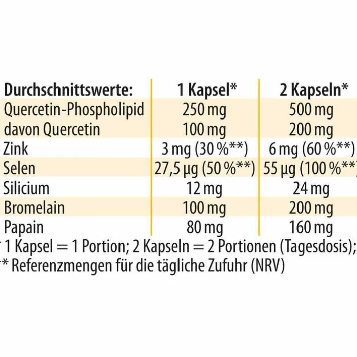 Quercetin ist ein wertvoller sekundärer Pflanzenstoff, der zur Gruppe der Polyphenole (Flavonoide) gehört. Das patentierte Quercetin-Phospholipid ermöglicht eine 20-mal höhere Bioverfügbarkeit als herkömmliches Quercetin. Dies belegt eine aktuelle Studie3. Das Besondere an Quercetin-Phospholipid ist die Kombination von Quercetin mit den pflanzlichen Enzymen Bromelain (aus Ananas) und Papain (aus Papaya).