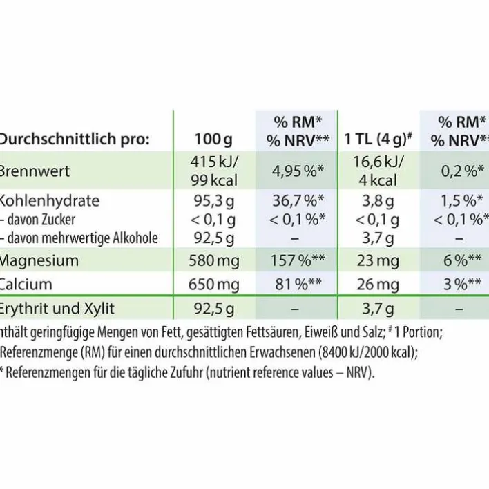 SteviaBase liefert einen relevanten Gesundheitsbeitrag zum Tagesbedarf an Magnesium (ab 2 ½ TL) und Calcium (ab 5 TL).