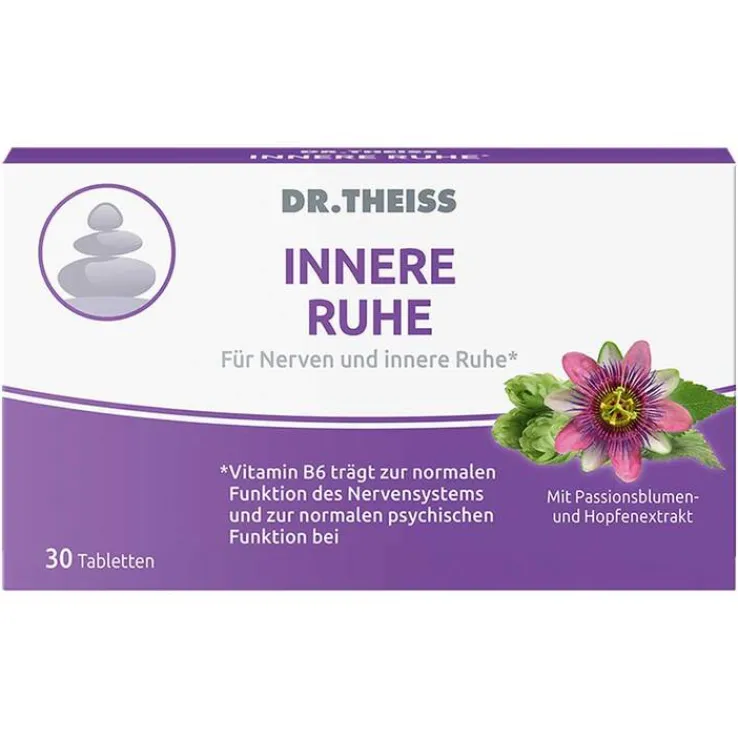Die Dr. Theiss Innere Ruhe Tabletten sind ein Nahrungsergänzungsmittel für Nerven und innere Ruhe*. Sie enthalten Passionsblumenextrakt und Hopfenextrakt, sowie Magnesium und Vitamin B6.