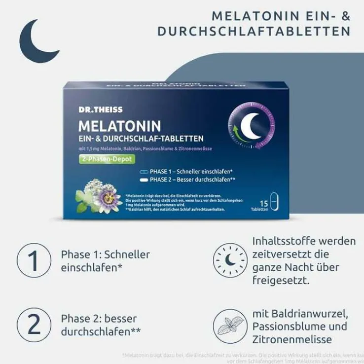 Dr. Theiss Melatonin Ein- & Durchschlaf-Tabletten sind ein Nahrungsergänzungsmittel mit Melatonin und Extrakten aus Baldrianwurzel, Passionsblume und Zitronenmelisse.