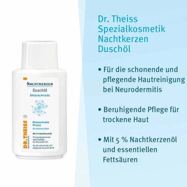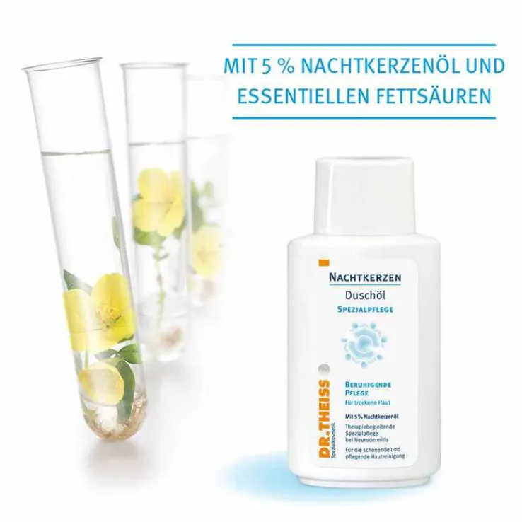 Die Pflegeformel der Dr. Theiss Nachtkerzen Serie basiert auf den wertvollen Inhaltsstoffen des Nachtkerzenöls wie u.a. die natürlichen essenziellen Fettsäuren Cis-Linolsäure und Gamma-Linolensäure. Die Produkte helfen der Haut, ihre wichtige Schutzfunktion gegen Umwelteinflüsse zu regenerieren, indem sie die Haut vor dem Austrocknen schützen. Eine sanfte Reinigung und Bäder mit rückfettenden Inhaltsstoffen sind für sehr trockene Haut und bei Neurodermitis besonders wichtig.