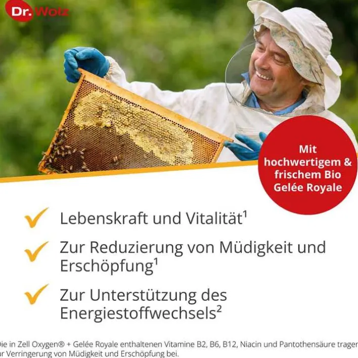Die Kombination der bewährten Enzym-Hefezellen Dr. Wolz mit Gelee Royale und ausgewählten B-Vitaminen ergibt ein kraftvolles Energiepaket. Gelée Royale ist das einzigartige Nährkonzentrat, von dem die Bienenköniginnen leben. Die Wirkung von Gelee Royale auf die Königinnenlarve grenzt beinahe an ein Wunder. Binnen fünf Tagen erlangt sie das 1800-fache ihres Anfangsgewichtes und in weiteren elf Tagen die Fähigkeit, täglich 2000 Eier zu legen.