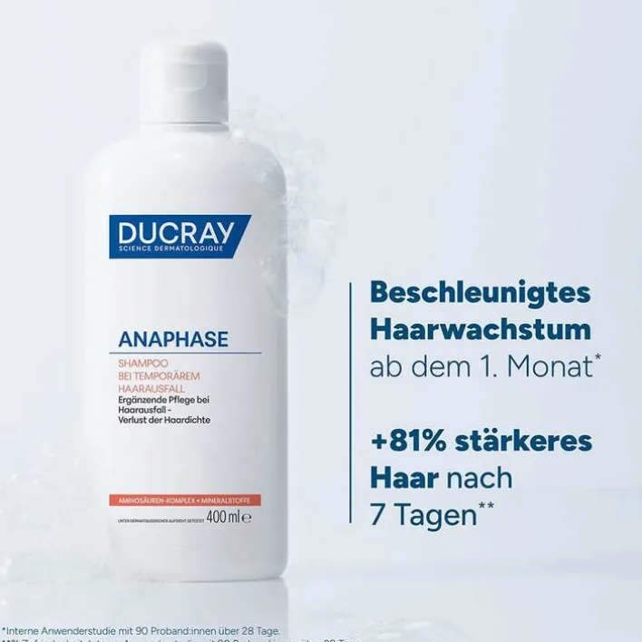 Das Anaphase Shampoo wurde speziell als Ergänzung für eine Behandlung bei temporärem Haarausfall entwickelt. Bei temporärem Haarausfall wird ergänzend die Anaphase Creastim Lotion von Ducray empfohlen.