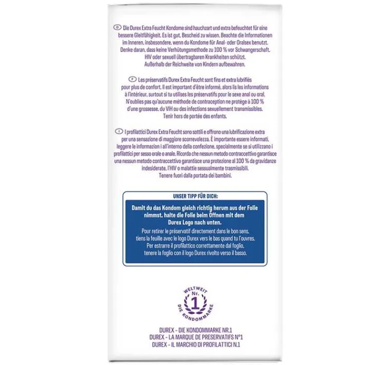 Die Durex extra feucht Kondome sind hauchzart und extra befeuchtet für eine bessere Gleitfähigkeit.