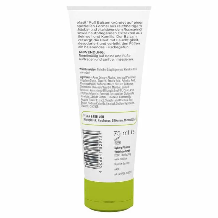 Die Rezeptur ist abgestimmt auf die stark beanspruchte Fußhaut. Mit dem Efasit Fuß Balsam bekommen Sie die ideale Pflege – für geschmeidige und glatte Füße. Der Balsam enthält eine spezielle Formel aus reichhaltigem Jojoba- und vitalisierendem Rosmarinöl sowie hautpflegenden und hautberuhigenden Extrakten aus Beinwell und Kamille.