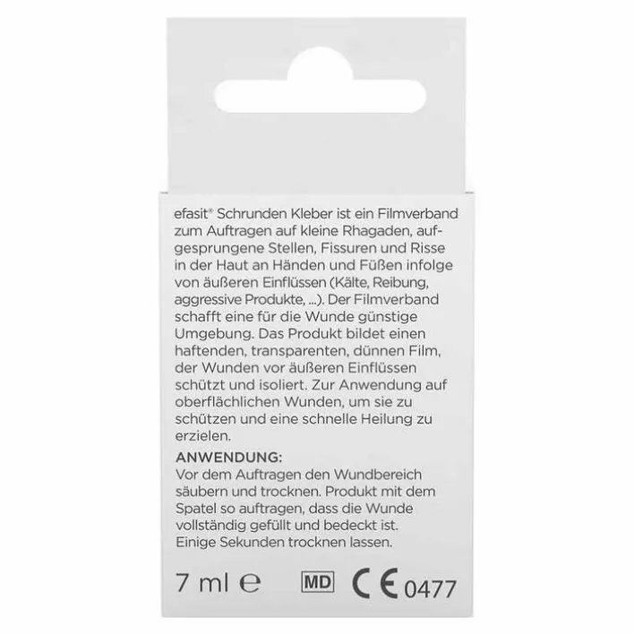 Efasit Schrunden Kleber ist ein Filmverband zum Auftragen auf kleine Rhagaden, aufgesprungene Stellen, Fissuren und Risse in der Haut an Händen und Füßen infolge von äußeren Einflüssen (Kälte, Reibung, aggressive Produkte, …). Der Filmverband schafft eine für die Wunde günstige Umgebung. Das Produkt bildet einen haftenden, transparenten, dünnen Film, der Wunden vor äußeren Einflüssen schützt und isoliert. Zur Anwendung auf oberflächlichen Wunden, um sie zu schützen und eine schnelle Heilung zu erzielen.
