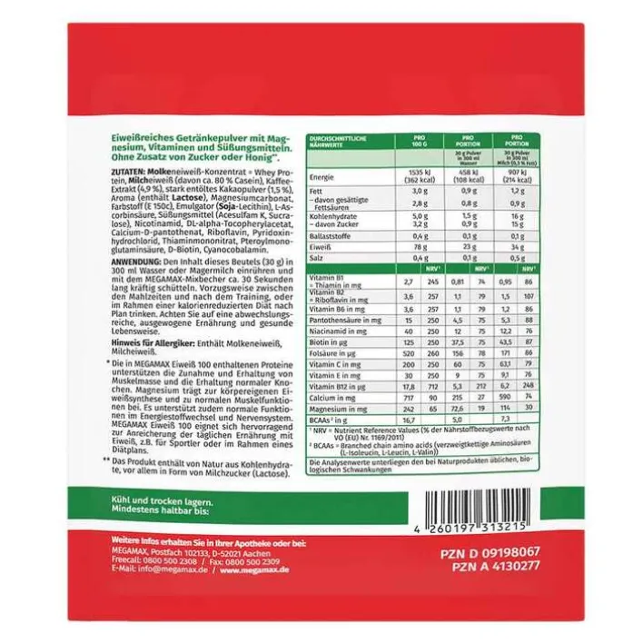 MEGAMAX Eiweiß 100 besteht aus Milcheiweiß und Molkenprotein. Diese Proteine unterstützen Ihren Körper bei der Zunahme und Erhaltung von Muskelmasse und tragen auch zu einer Erhaltung normaler Knochen bei. Daneben enthält MEGAMAX Eiweiß 100 auch eine Auswahl von Vitaminen. Vitamin B12 zum Beispiel trägt zu einem normalen Ablauf Ihres Energiestoffwechsels bei und Vitamin C unterstützt die normale Funktion Ihres Immunsystems während und nach intensiver körperlicher Betätigung.