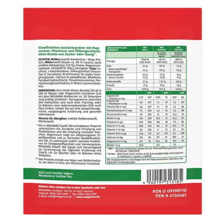MEGAMAX Eiweiß 100 besteht aus Milcheiweiß und Molkenprotein. Diese Proteine unterstützen Ihren Körper bei der Zunahme und Erhaltung von Muskelmasse und tragen auch zu einer Erhaltung normaler Knochen bei. Daneben enthält MEGAMAX Eiweiß 100 auch eine Auswahl von Vitaminen. Vitamin B12 zum Beispiel trägt zu einem normalen Ablauf Ihres Energiestoffwechsels bei und Vitamin C unterstützt die normale Funktion Ihres Immunsystems während und nach intensiver körperlicher Betätigung.