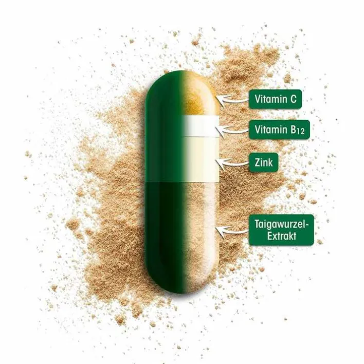 Nahrungsergänzungsmittel mit Vitamin B12, Vitamin C, Zink und Taigawurzel-Extrakt