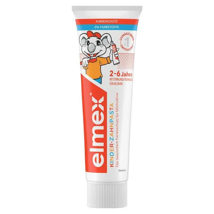 Die Elmex Kinderzahnpasta macht die Zähne widerstandsfähiger gegen kariesbedingten Mineralien-Abbau. Sie hilft, die durch Karies herausgelösten Mineralien wieder in den Zahnschmelz einzubauen und bildet eine Kalziumfluorid-Deckschicht auf dem Zahnschmelz.