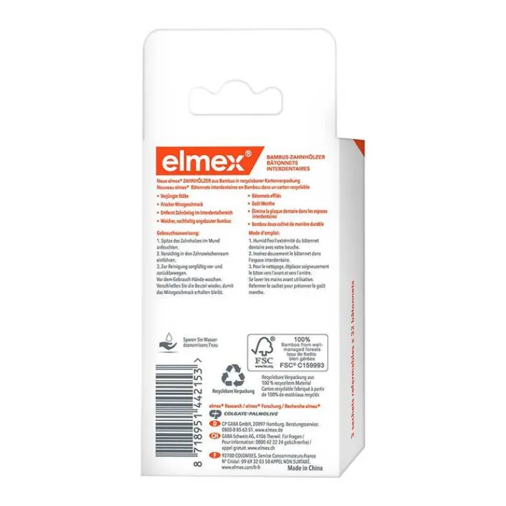 Elmex Zahnhölzer sind aus weichem nachhaltig angebauten Bambus. Die Zahnhölzer mit frischem Minz-Geschmack und Aminfluorid entfernen Zahnbelag im Interdentalbereich, splittern wenig und sind nach oben verjüngt.