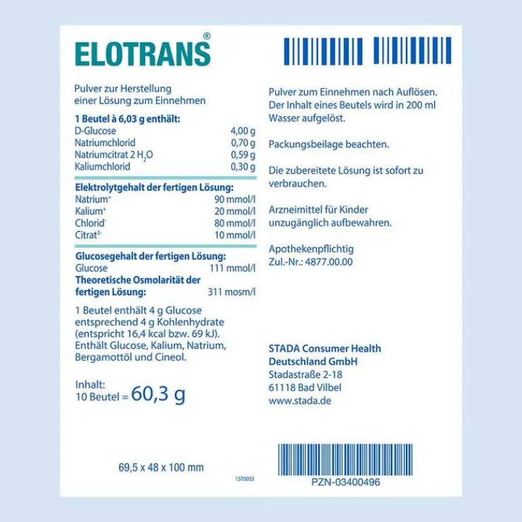 Elotrans® Pulver zur Herstellung einer Lösung zum Einnehmen Wirkstoffe: D-Glucose, Natriumchlorid, Natriumcitrat, Kaliumchlorid. Zur oralen Salz- (Elektrolyt-) und Flüssigkeitszufuhr (Ausgleich von Salz- und Wasserverlusten) bei Durchfallerkrankungen. Hinweise: Jeder Durchfall kann Anzeichen einer schweren Erkrankung sein. Bei längerer Dauer und/oder Beeinträchtigung des Allgemeinbefindens ist daher unverzüglich ein Arzt aufzusuchen. Insbesondere bei Säuglingen und Kleinkindern können Durchfälle, besonders bei gleichzeitigem, unstillbarem Erbrechen, rasch zu schweren Krankheitserscheinungen (Bewusstseinstrübung, Schock) führen. Es ist daher bei der Durchfallbehandlung von Säuglingen und Kleinkindern in jedem Fall ein Arzt hinzuzuziehen. Enthält Glucose, Kaliumchlorid und Natriumverbindungen. Zu Risiken und Nebenwirkungen lesen Sie die Packungsbeilage und fragen Sie Ihre Ärztin, Ihren Arzt oder in Ihrer Apotheke. STADA Consumer Health Deutschland GmbH, Stadastraße 2–18, 61118 Bad Vilbel | Stand: September 2019
