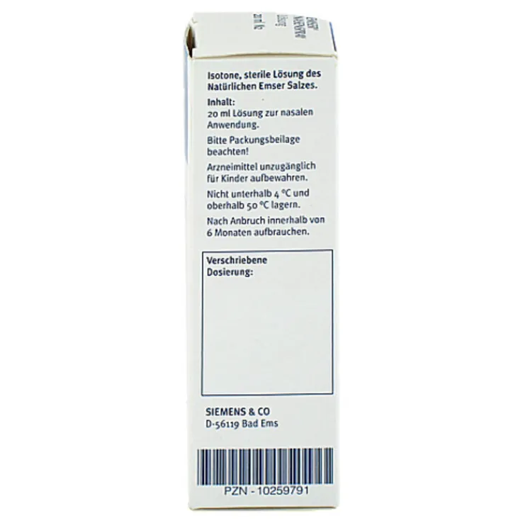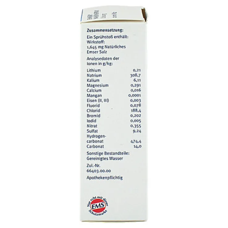 Emser® Nasenspray: Wirkstoff: Natürliches Emser Salz. Anwendungsgebiete: Zur unterstützenden Behandlung durch Befeuchtung, Reinigung und Abschwellung der Nasenschleimhaut bei banalen akuten Infektionen der oberen Atemwege und chronischen Nasen- und Nasennebenhöhlenentzündungen und als begleitende Behandlungsmaßnahmen zur Beschleunigung des Heilungsprozesses nach endonasaler Nebenhöhlenoperation. Zu Risiken und Nebenwirkungen lesen Sie die Packungsbeilage und fragen Sie Ihre Ärztin, Ihren Arzt oder in Ihrer Apotheke. Sidroga Gesellschaft für Gesundheitsprodukte mbH, 56119 Bad Ems.