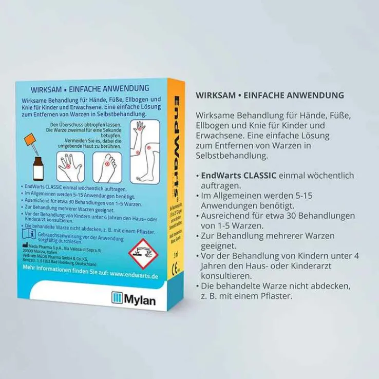 - Vor Anwendung Gebrauchsanweisung sorgfältig durchlesen. Verwenden Sie EndWarts® CLASSIC nicht bei Gesichtswarzen, Warzen im Genitalbereich, Dellwarzen, Muttermalen, Hühneraugen, Hautverhärtungen oder anderen Hautveränderungen.