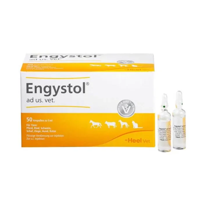 Engystol ad us. vet., Flüssige Verdünnung zur Injektion. Registriertes homöopathisches Arzneimittel, daher ohne Angabe einer therapeutischen Indikation. Wartezeit: Pferd, Rind, Schwein, Schaf, Ziege: Essbare Gewebe: Null Tage; Pferd, Rind, Schaf, Ziege: Milch: Null Stunden. Zu Risiken und Nebenwirkungen lesen Sie die Packungsbeilage und fragen Sie Ihren Tierarzt oder Apotheker. Biologische Heilmittel Heel GmbH, 76532 Baden-Baden, Februar 2019