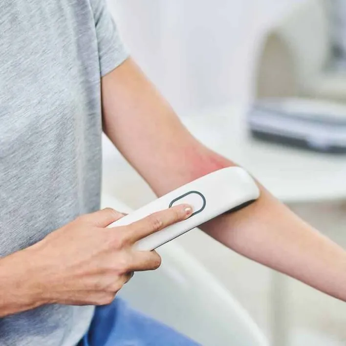 Das Gerät wirkt mit kurzer, konzentrierter Wärmeeinwirkung auf ein eng begrenztes Hautareal. Die optimale Temperatur des Wärmeeintrags zwischen 47 °C und 49 °C aktiviert Rezeptoren in der Haut. In der Folge wird nur der Wärmereiz weitergeleitet – für den Juckreiz ist der Signalweg dagegen blockiert. Der Effekt: Unmittelbar nach Behandlung lässt der Juckreiz nach und Linderung kann einsetzen.