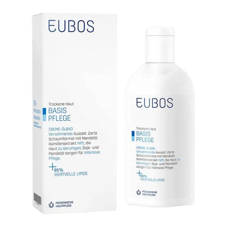Das Creme Ölbad enthält eine rückfettende, pflegende Lipidmischung kombiniert mit mild reinigenden Waschrohstoffen. Das Eubos Creme Ölbad ist mit Soja- und Mandelöl, reich an ungesättigten, essentiellen Fettsäuren. Der enthaltene Kamillenextrakt beruhigt die Haut. Es sind über 65% reichhaltige und pflegende Öle enthalten, die sich schon beim Baden wie ein schützender Film auf die Haut legen. Die Verträglichkeit wurde dermatologisch getestet.