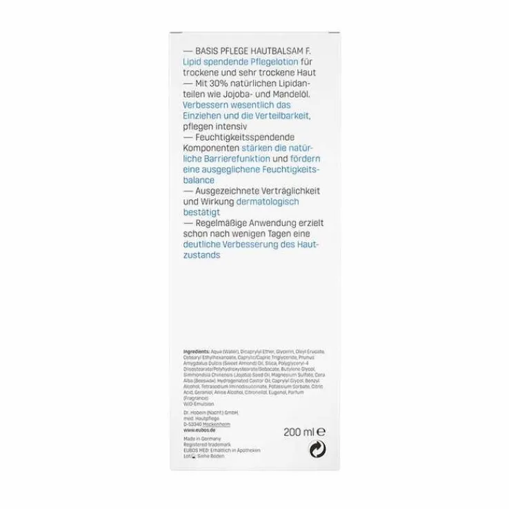 Eubos Hautbalsam F ist eine lipidspendende Pflegelotion für trockene und sehr trockene Haut. Sie enthält 30% natürliche Lipidanteile wie z.B. Jojoba- und Mandelöl. Diese verbessern wesentlich das Einziehen und die Verteilbarkeit der Lotion und pflegen intensiv. Feuchtigkeitsspendende Komponenten stärken die natürliche Barrierefunktion und fördern eine ausgeglichene Feuchtigkeitsbalance. Die ausgezeichnete Verträglichkeit und Wirkung wurde dermatologisch bestätigt. Eine regelmäßige Anwendung erzielt schon nach wenigen Tagen eine deutliche Verbesserung des Hautzustands.